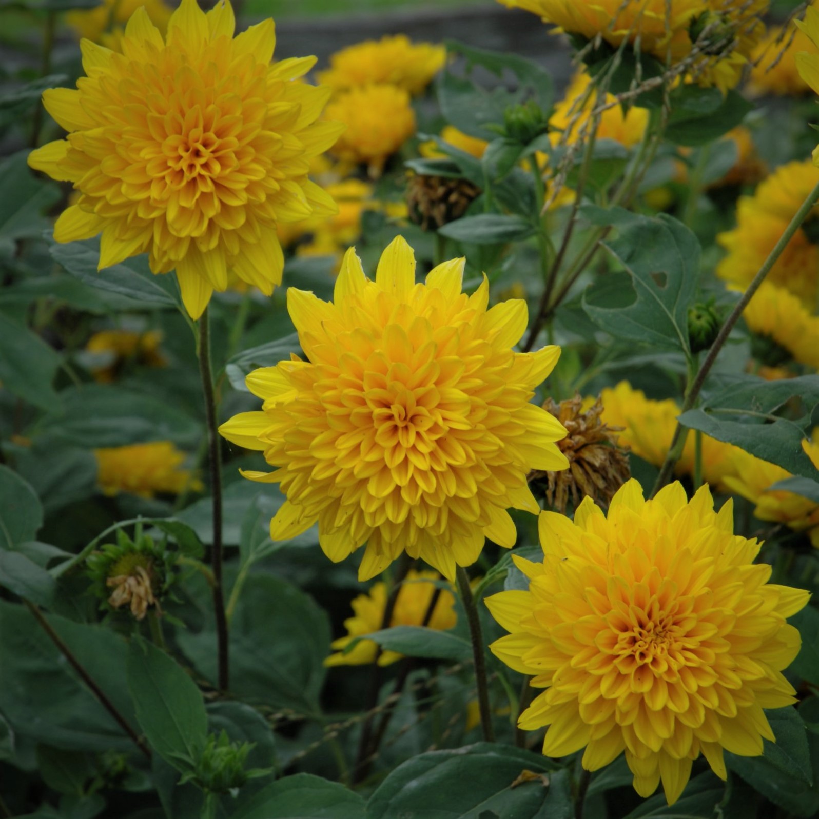 Juli-oktober, 150-180 cm, gyldengule blomster, fyldige store ponponblomster, blomsterrig, snitblomst, sol-let skygge.