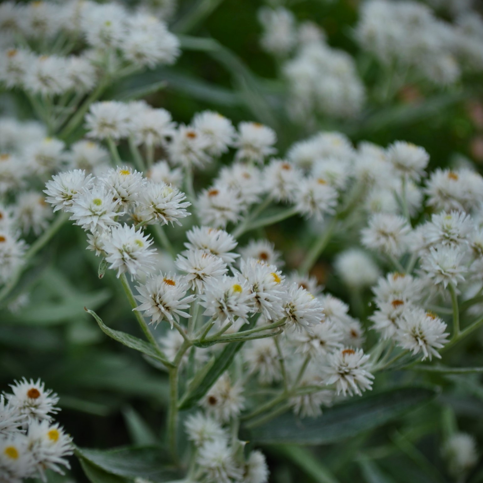 Juli - august, 50 cm, hvide blomster med grå blade, sol-halvskygge, kan tørres, snitblomst