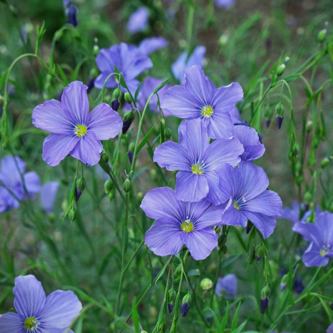 Maj - august, 50 cm, blå blomster, spiselige frø, staude til tør jord, sol, stenbed, prærieplante, selvsående, let udtryk,