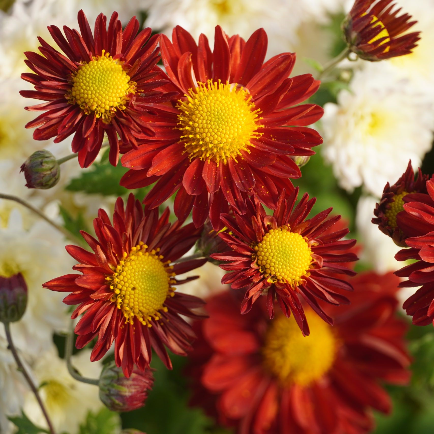 Oktober-november, 70 cm, røde blomster med stor gul midte, rigtblomstrende, sol, snitblomst, vinterhårdfør, også egnet til krukker, tiltrækker insekter. Let jord