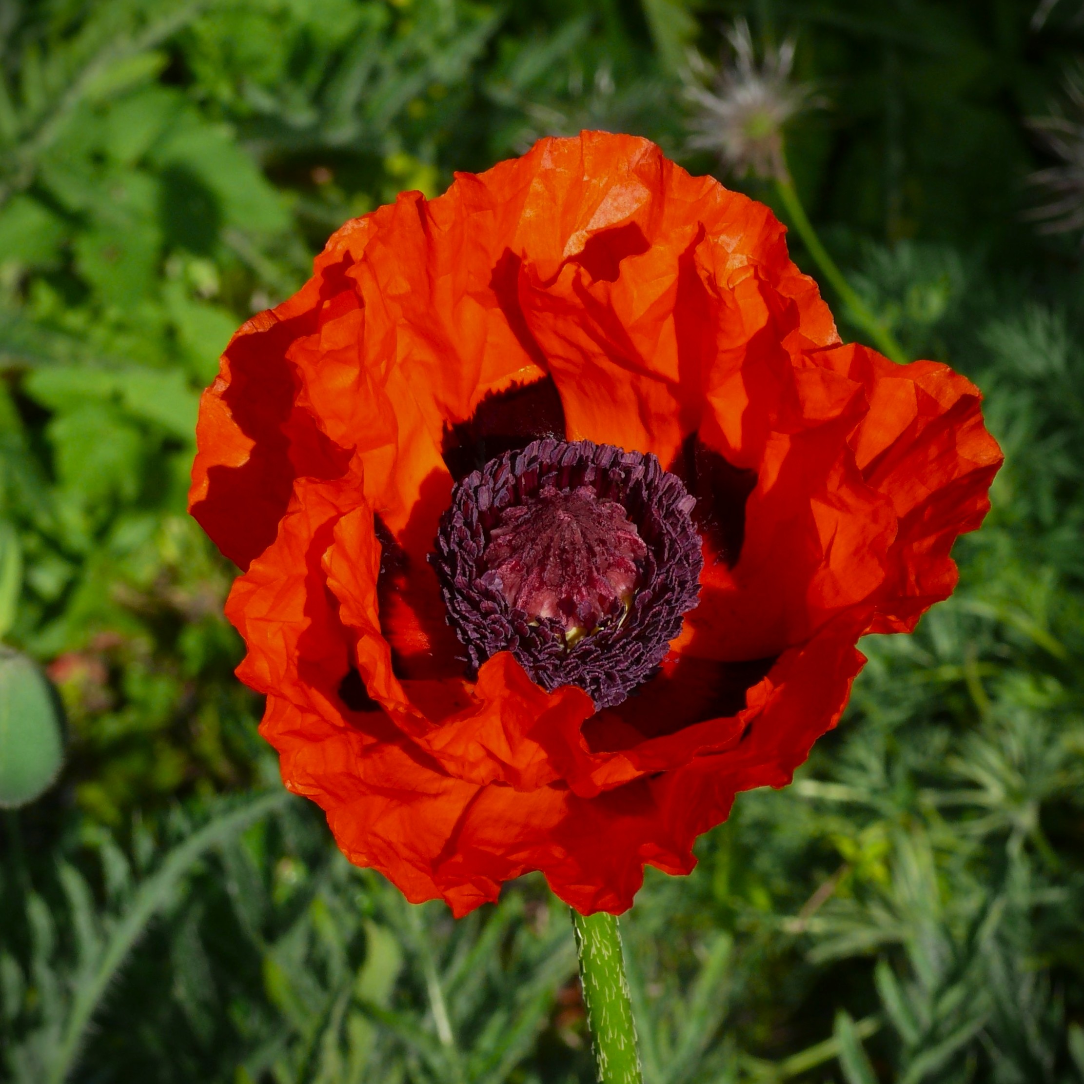 Maj-juni, 60 cm, halvdobbelte orangerøde store blomster med sort midte, sol, ikke for våd jord, snitblomst, tiltrækker bier og sommerfugle.