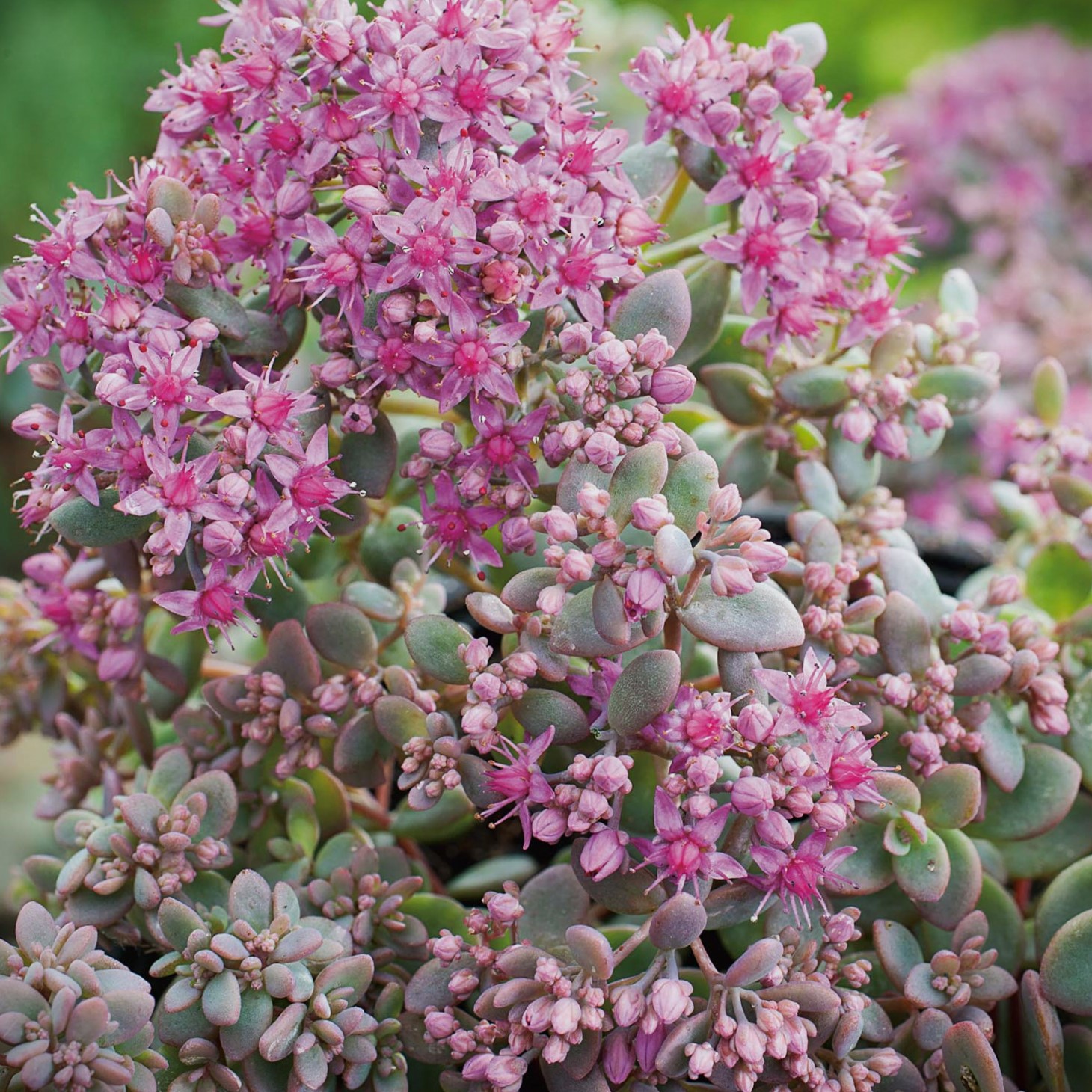 Juli-august, 10-15 cm, lyserød, sol, tæppedannende, tørketålende, evt i stenbed, tiltrækker insekter