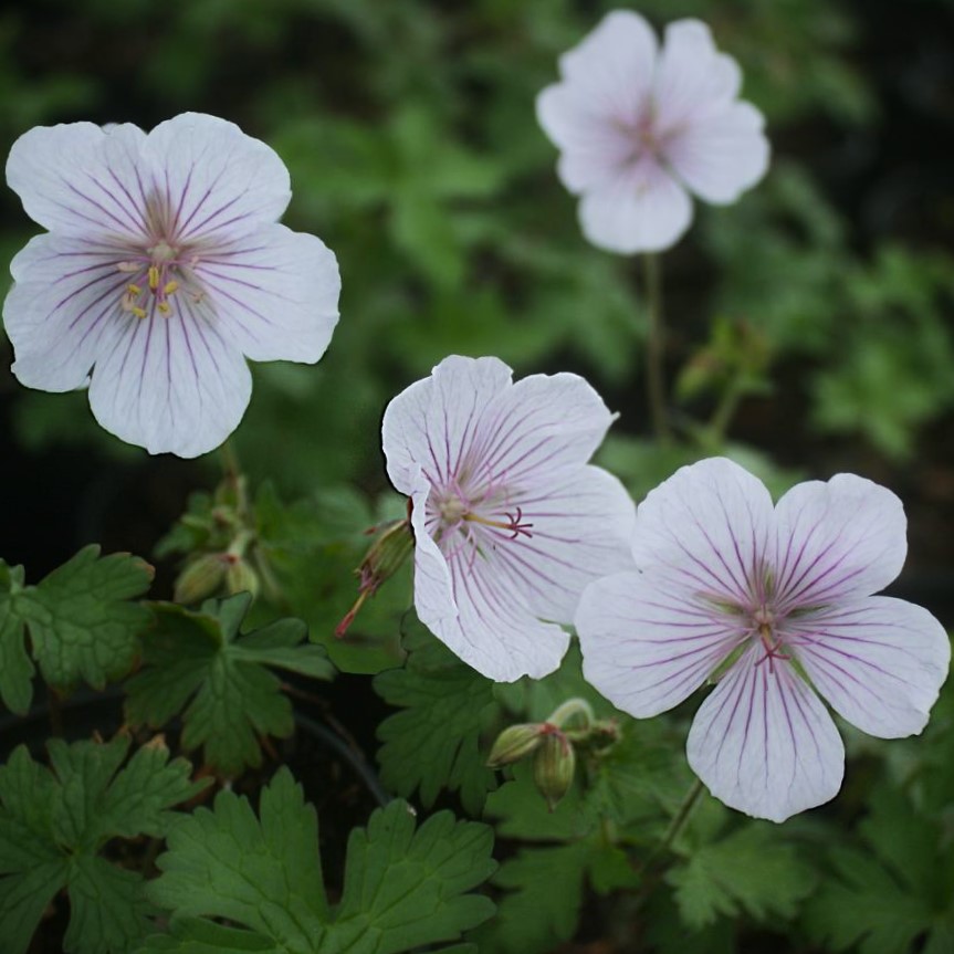 Maj - juni, 30 cm, sølvhvid med violette årer, sol - halvskygge, stortblomstrende, bunddække