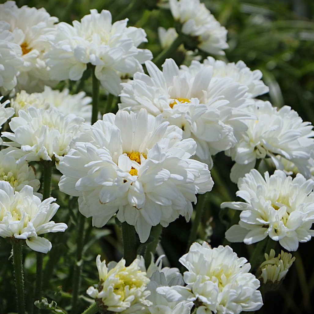 Juni-september, 50 cm, halvfyldte hvide blomster, sol, snitblomst, deles hver tredje år.