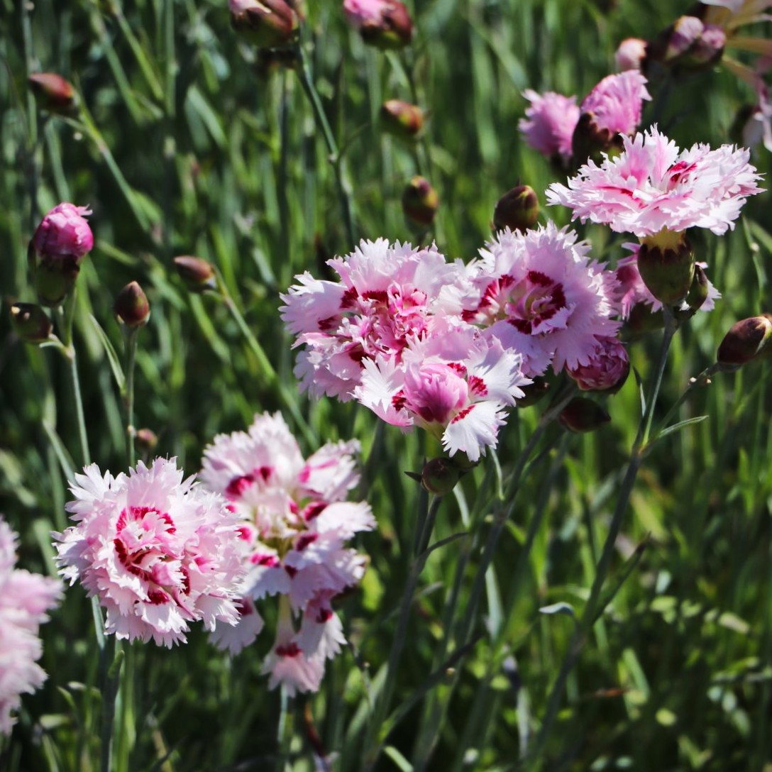 Juni-juli 30 cm, hvid m. mørkrosa midte, snitblomst, duftende, sol evt stenbed eller tør vokseplads