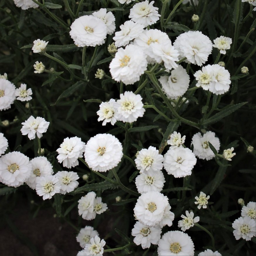Juni - august, 50 cm, hvide dobbeltblomster, sol. mere kompakt end arten, breder sig villigt ved udløbere, tørketålende staude
