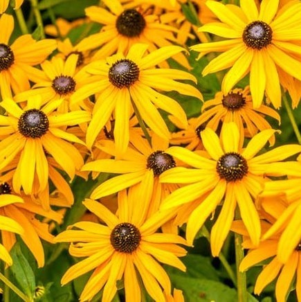 Juli-oktober, 80 cm, gule blomster med sort midte, breder sig meget, snitblomst, tiltrækker bier og andre insekter